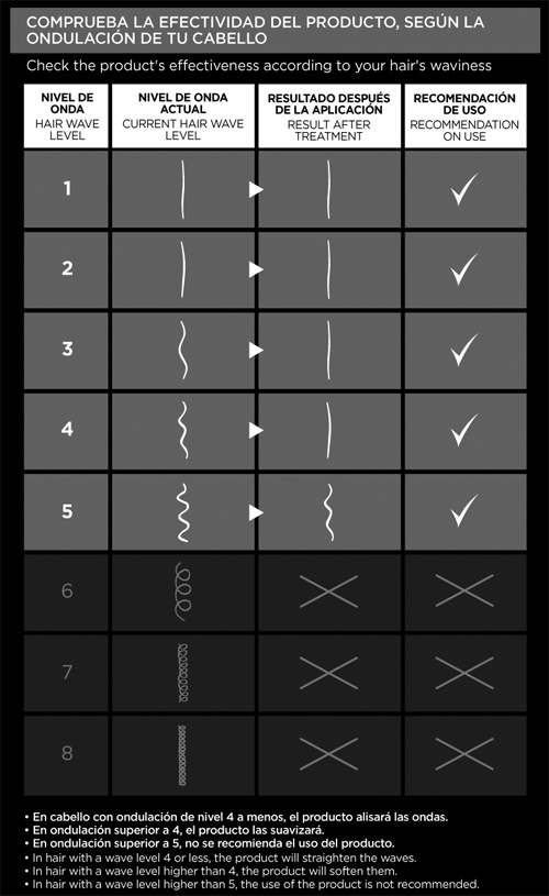 - En cabellos con un nivel de onda de 4 o menos, el producto alisará las ondas, reducirá el volumen y eliminará el frizz.