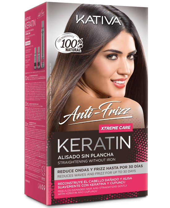 Kativa Keratin Antifrizz es un alisado sin plancha y sus fórmulas basadas en la tecnología NICTECH, eliminan el frizz y reducen las ondas hasta por 30 días, sin necesidad de plancha. Enriquecido con proteína de Keratina e ingredientes naturales, deja un alisado suave y sin volumen.